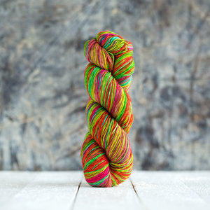 You'll find yourself wanting to get to the next color with Urth Uneek Fingering self-striping sock yarn. This colorful hand-dyed fingering weight yarn gradually shifts from one vibrant color to another. For a pair of traditional socks, go with a plain vanilla sock pattern that uses stockinette stitch to showcase the colorful stripes. Not into sock knitting? How about a pair of colorful striped mittens or a versatile cowl to dress up your favorite pair of jeans.